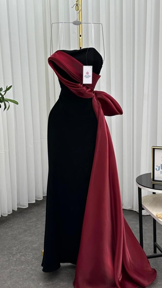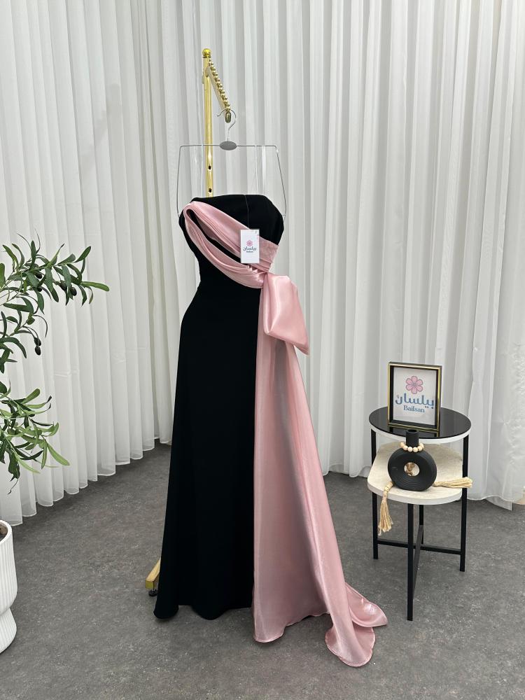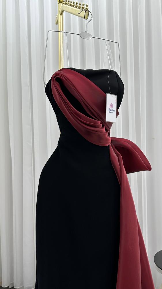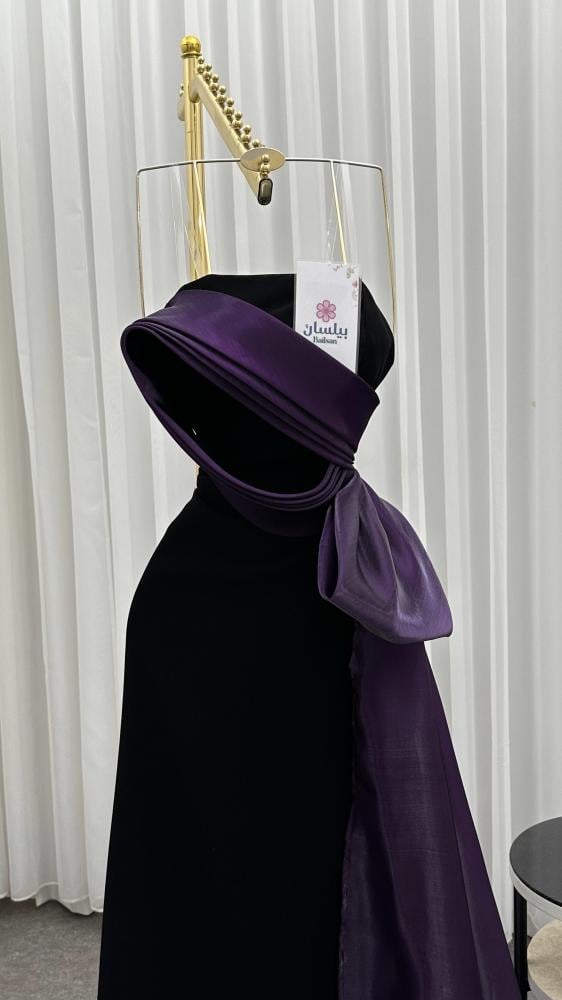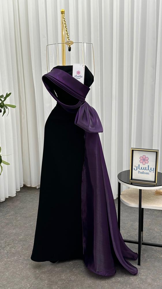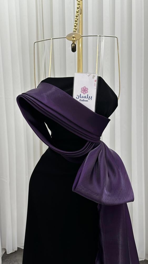 فستان سهرة فاخر بلون أسود ملكي مزين بوشاح اورجانزا لامع ينسدل بانسيابية من الصدر إلى الأرض، يجمع بين الرقي والنعومة بأسلوب جذاب ومميز